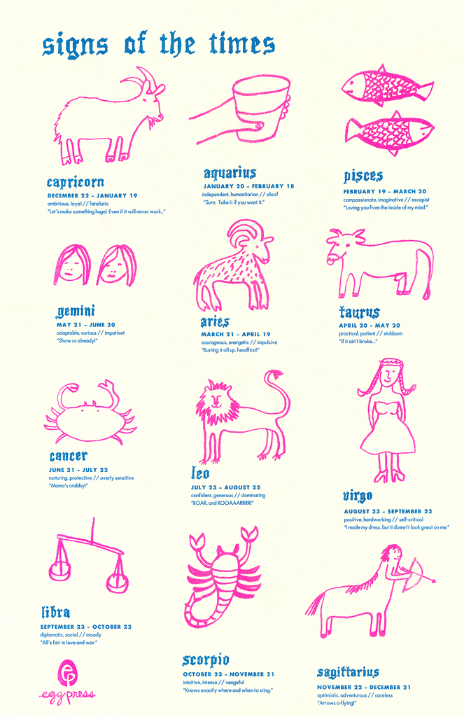A cheeky reference poster for keeping track of all those beloved, pesky signs. Each sign includes its dates and traits, both positive and negative.